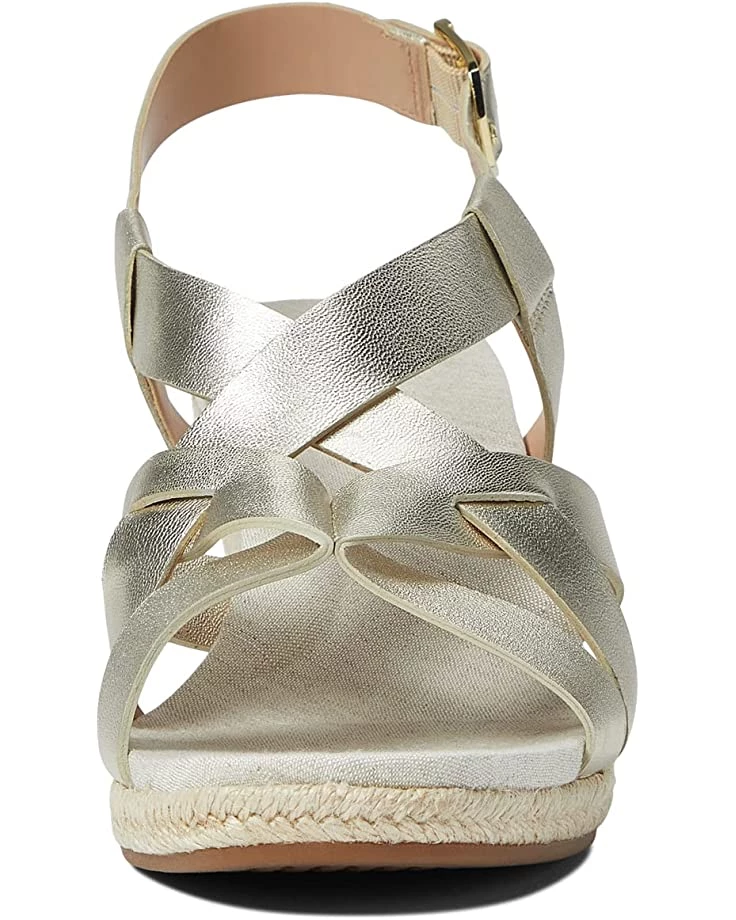 Very comfortable wedge with a lot of cushion in the sole. The height and angle are perfect to give lift while being very easy to walk in. The straps are a very soft leather and didn’t cause any rubbing or blisters on the first wear. The color is a pretty soft gold. Highly recommend!